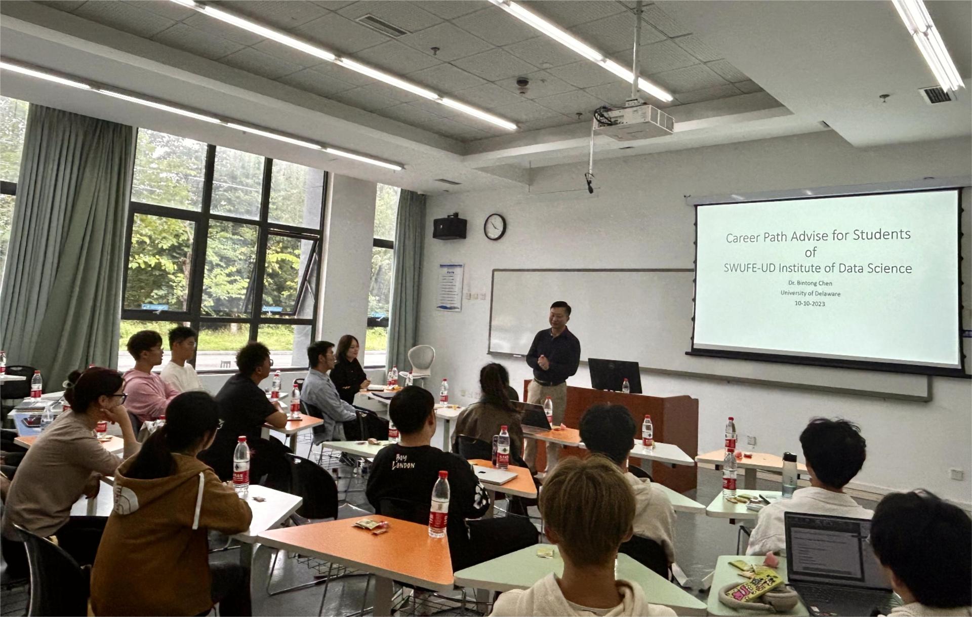 10月10日,陈教授向到场的同学深度介绍了特拉华大学金融服务分析博士项目的信息,并就“是否应该读博”“如何申请博士”等问题展开分享交流。分享会开始前,陈教授分别让到场的同学们进行个人规划介绍,便于更加了解西财特院学子。此外教授中英双语分享个人读书经历,如何考上世界顶级商学院,以及成为特拉华大学教授的原因契机。