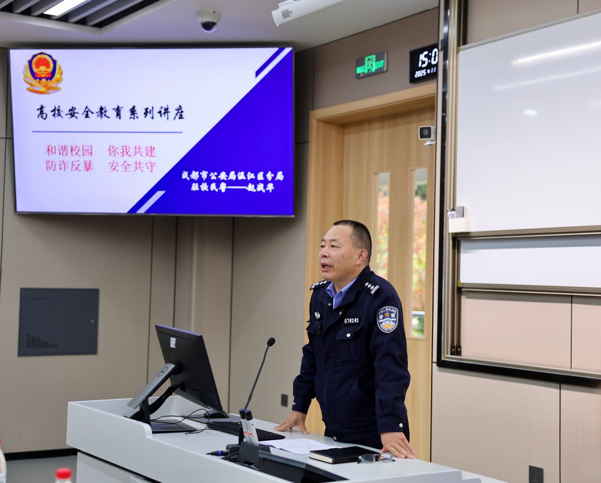 在经世楼F102举办了学生安全教育专题讲座。本次讲座由学院学生支持与发展办公室主任马蕾主持,各年级学生积极参与。讲座特邀温江区公安分局云溪派出所驻校民警赵战华、学校保卫处安全教育办公室宣讲干部罗松涛和胡航宇担任主讲。