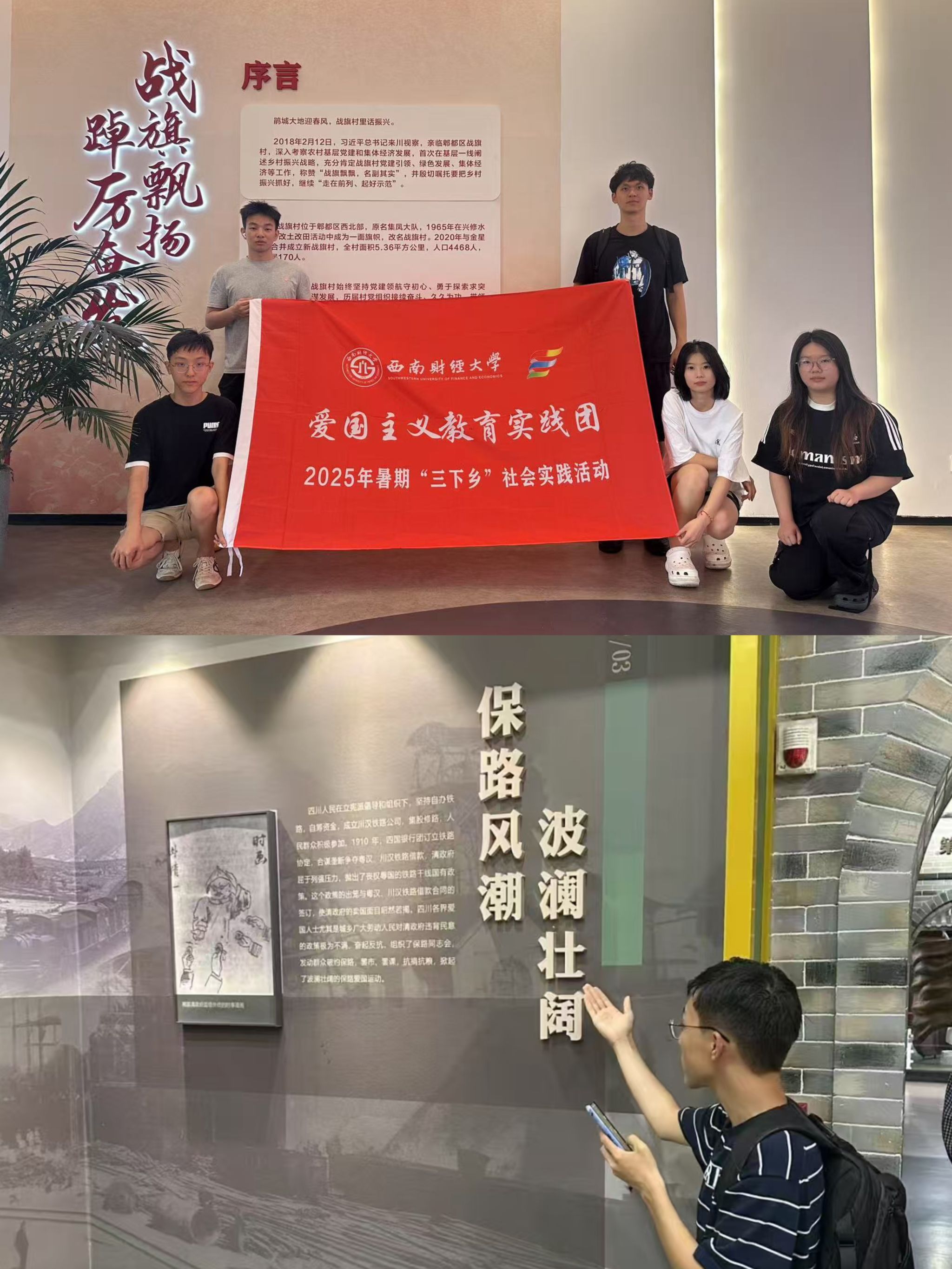 “星火金穗”实践队以“薪火传乡,财经报国”为主题,在四川保路运动史事陈列馆和成都市郫都区战旗村开展为期11天的实践。团队围绕红色教育与乡村振兴开展深度调研,走访村委会、考察产业集群、参与乡风文明建设,并开展财经知识普及,计划形成两份调研报告,提炼典型案例。