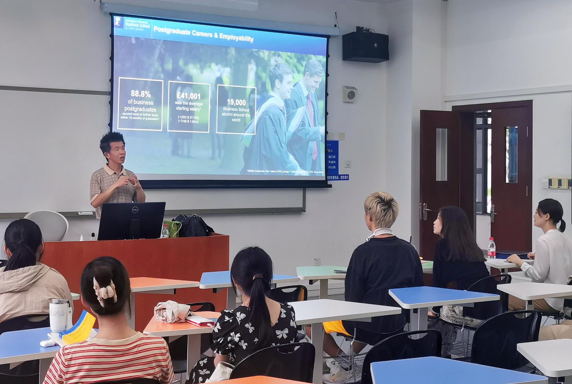 会后,诺丁汉大学Jimmy Huang一行面向我院学生开展交流宣讲。Jimmy Huang生动风趣地介绍了诺丁汉大学先进的办学理念、优美的校园环境以及丰富多彩的社团活动,让同学们对这所历史悠久、底蕴深厚的学府有了更加深刻和清晰的认识。Jimmy Huang还介绍了金融领域未来就业前景,讲解了金融科技等交叉学科的应用和市场需求。Jimmy Huang和Lily Ma与现场学生积极互动,回答了同学们关于出国留学方面的问题。