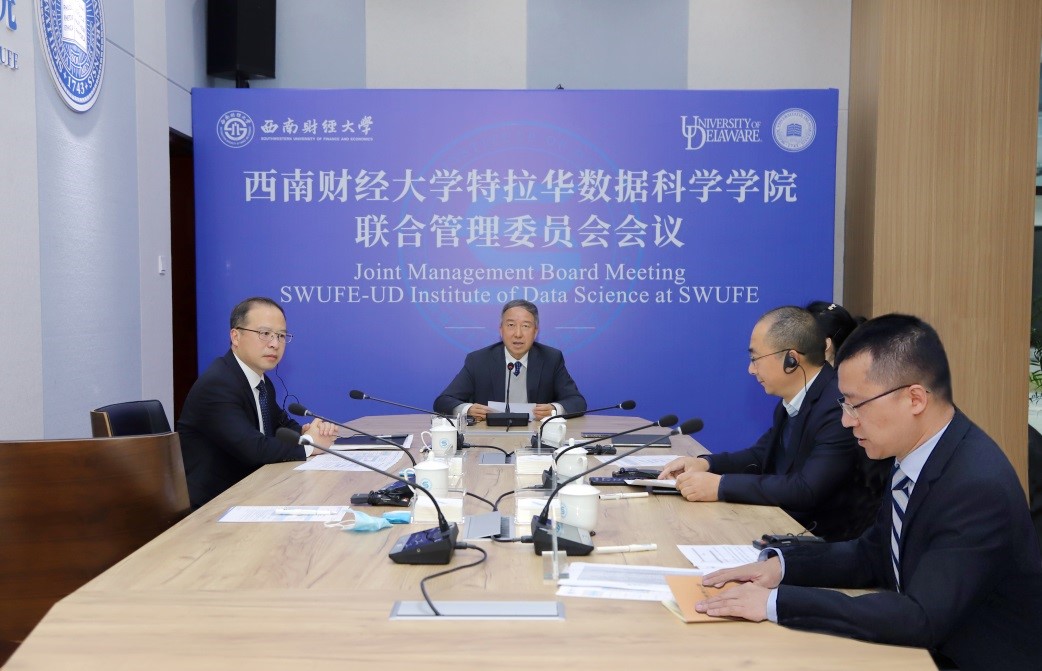 On the morning of April 1, the Joint Management Board meeting of SWUFE-UD Institute of Data Science was held for the 2021-2022 academic year. Due to the pandemic, the meeting was held via video link. ZHUO Zhi, president of SWUFE and chairman of the Joint Management Board of SWUFE; LI Yongqiang, vice president of SWUFE; Dennis Assanis, president of the University of Delaware and vice chairman of the university's Joint Management Board; Robin Morgan, Executive Vice President; and members of the two university's joint management board attended the meeting. The meeting was moderated by Yang Shilei, dean of SWUFE-UD Institute of Data Science.